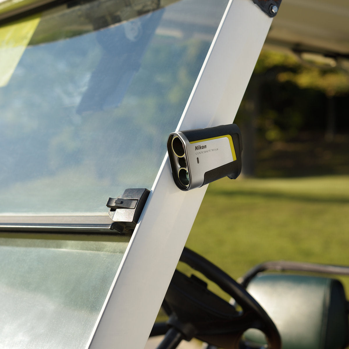 The Nikon CoolShot 50i GII is always ready when you need a quick distance reading. A built-in magnetic mount on the right side of the body lets you mount it on your cart or bag for easy access. The 50i GII features Dual Locked On Quake, which gives both visual and vibrational signals when it locks on the flag stick anywhere within 400 yards. Slope compensation mode is available for use when permitted, and a green LED is lit when in actual distance mode. First Target Priority mode helps find the pin against any background.