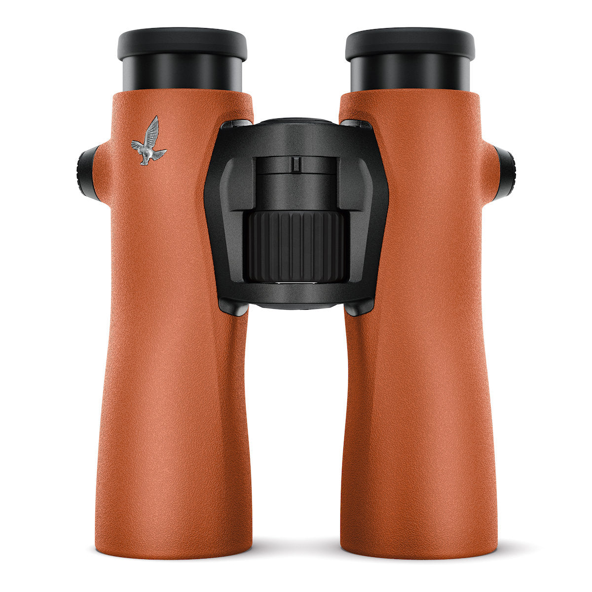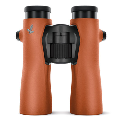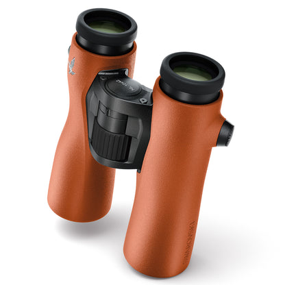 Swarovski NL Pure 8x42 Binoculars Burnt Orange have the widest field of view of any 42mm binocular - 477' at 1000 yds! Inside, they are the same as the green version. They have all of the Swarovision features of the ELs in a rubber armored body designed with slimmer tubes to optimally position your hands for long term viewing. Close focus is 6.6' and it takes less than 2 full turns of the focus wheel to get there from infinity. Light transmission is 91% from end to end. The NL Pure's eye relief is 18mm, and field flattener lenses in the eyepiece assembly provide a virtually distortion-free view. The strap and lens coverings attach in the same manner as the EL Pro models, but the case newly designed to make access easier. Also included with each NL Pure binocular is Swarovski's Universal Comfort Strap, a microfiber cloth, and a soap and brush kit for cleaning the rubber armor! Of course, the NL Pure binoculars are waterproof and nitrogen purged to be fogproof. There is an interesting optional accessory available for the NL: a forehead rest that can help steady your hold of the binocular. It is especially useful for eyeglass wearers or those using the 12x42 model.